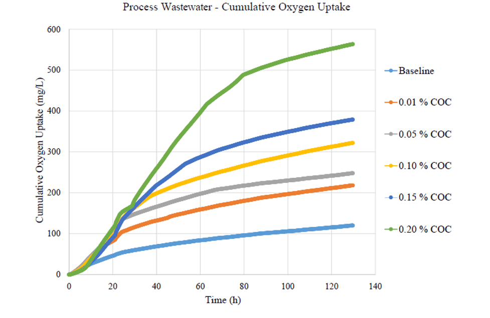 Oxygen uptake was measured by a PF-8000 Respirometer System capable of reading incremental respiration values of less than 0.1 mg O2 via pressure transduction. Ten 500 mL reactors were prepared to evaluate the impact of the COC at five different concentrations, which were indicated by the client, as well as two baseline control reactors. Each reactor was monitored for cumulative oxygen uptake. The reactors were prepared by introducing increasing concentrations of the COC in accordance with the following matrix: