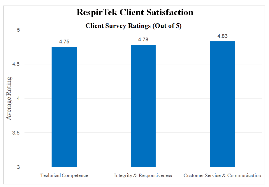 At RespirTek, Inc., client feedback is essential to our commitment to excellence in biodegradability testing and environmental laboratory services. As an ISO/IEC 17025:2017 accredited biodegradability lab, we deliver scientifically rigorous results, transparent communication, and reliable service that clients trust worldwide.The following data represents cumulative feedback since our survey began in 2010. We use the results to establish and improve upon organizational performance metrics.